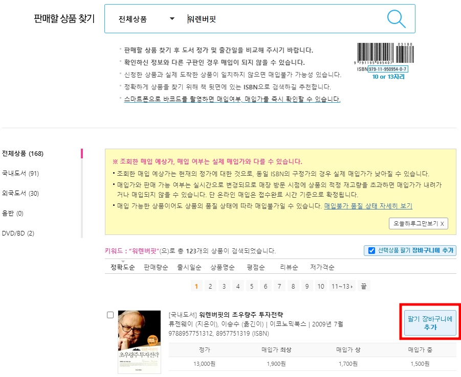3) 판매할 상품(도서) 명 입력 후, 아래쪽에서 내가 원하는 책을 팔기장바구니에 추가