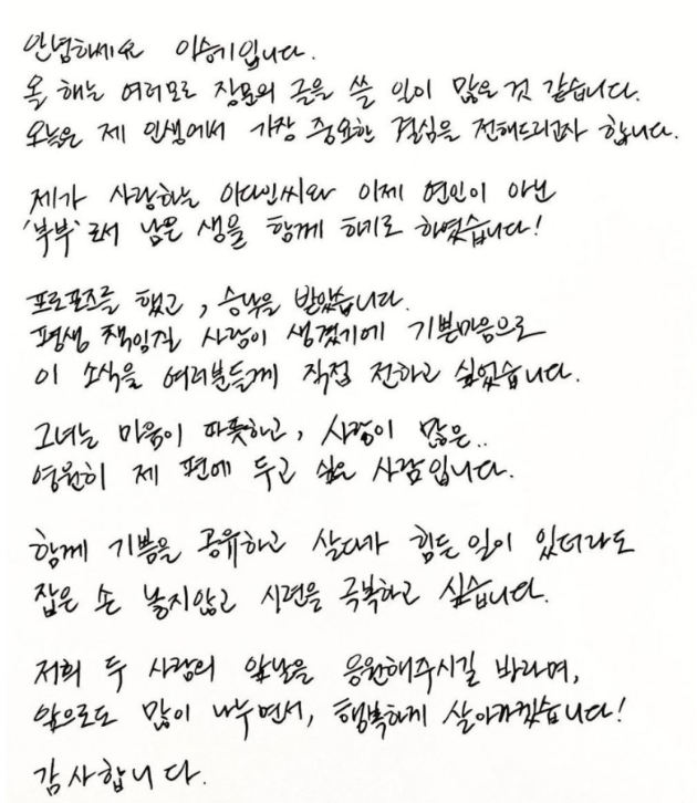마지막으로 이승기는 오늘 결혼 소식을 SNS에서 손 편지로 공개하여 화제가 되고 있습니다.